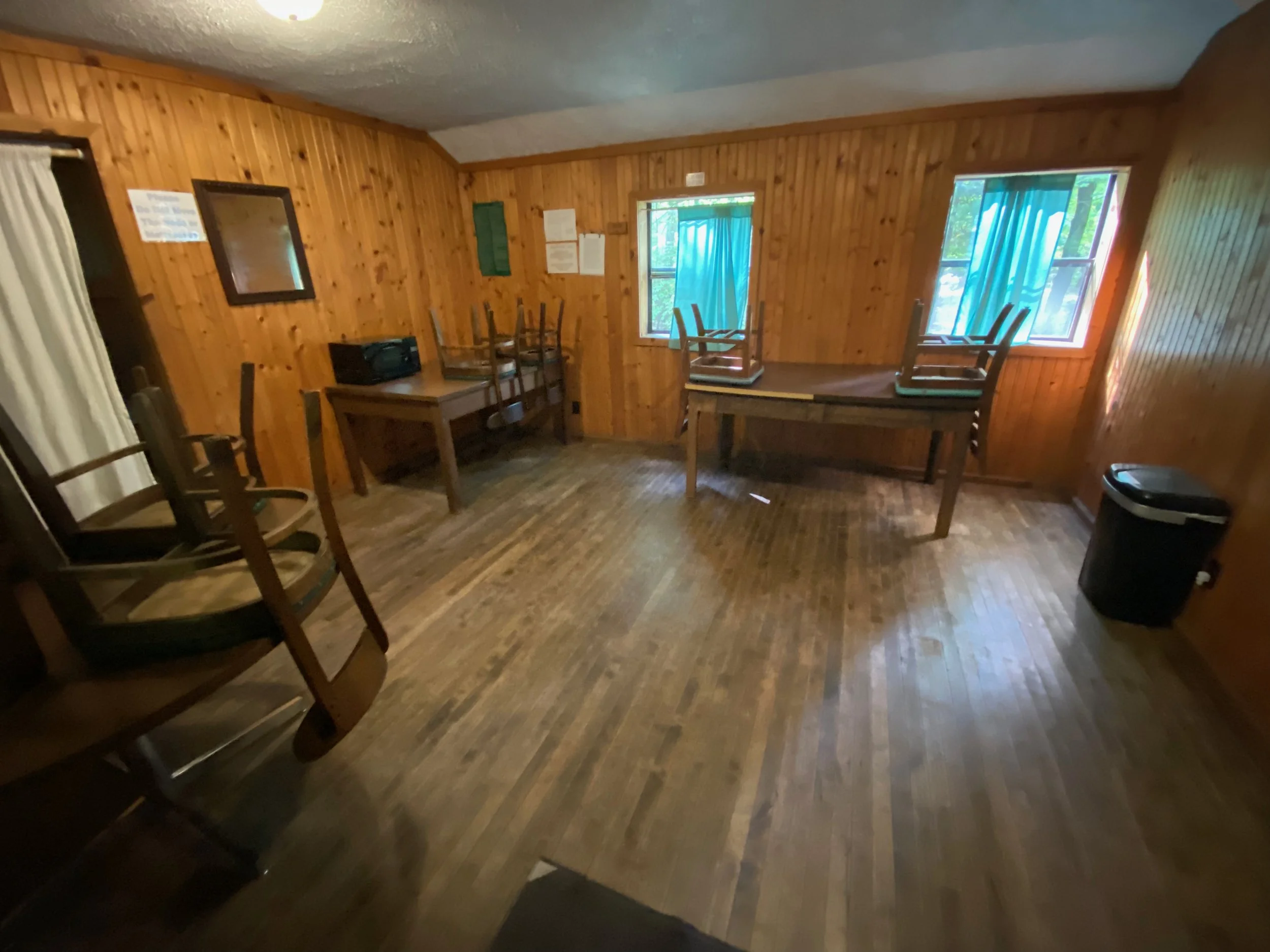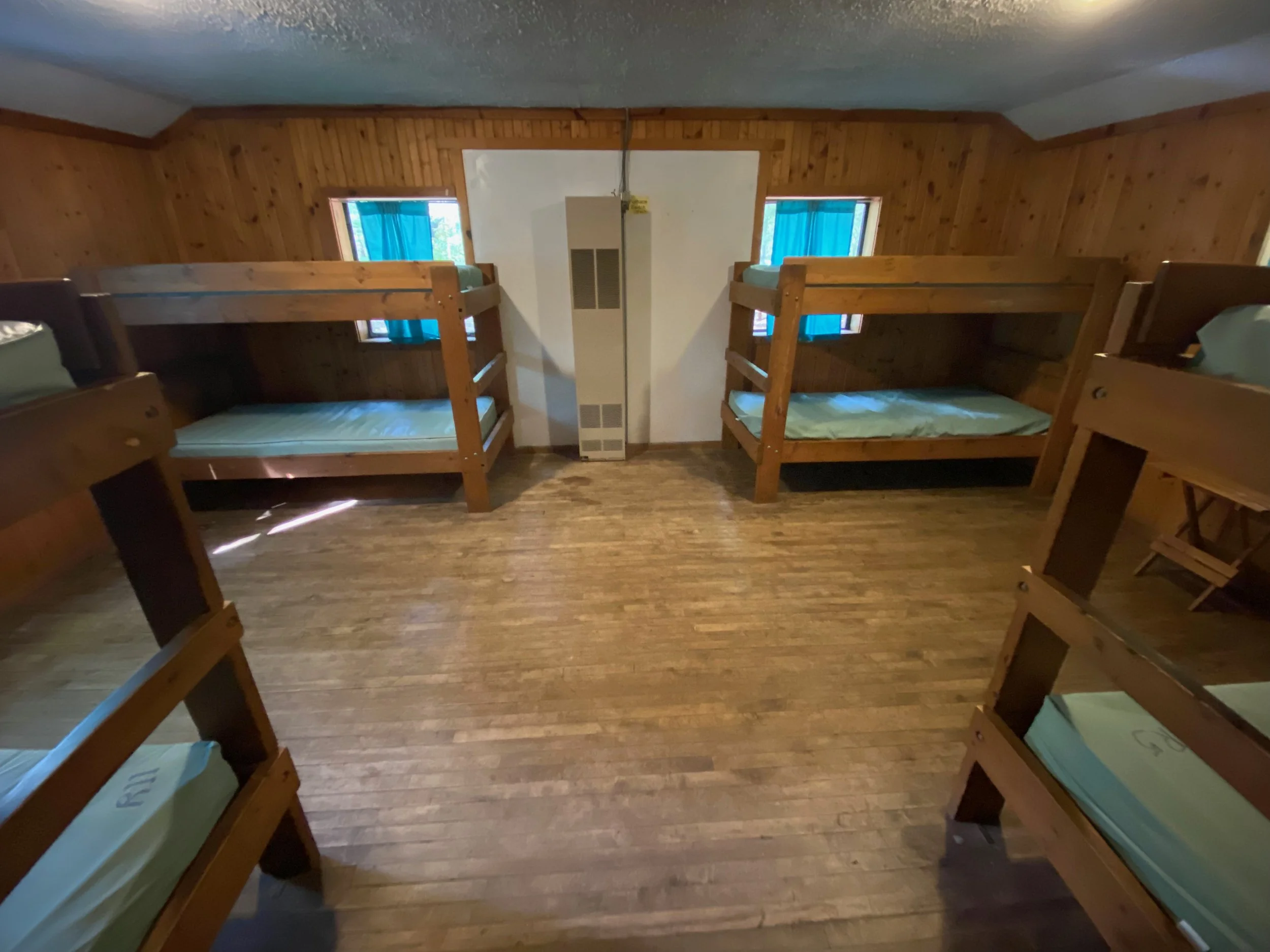 - 20-bed (10 bunk bed) group bunkhouse with two sleeping areas separated by a large central common room/lounge with a masonry fireplace